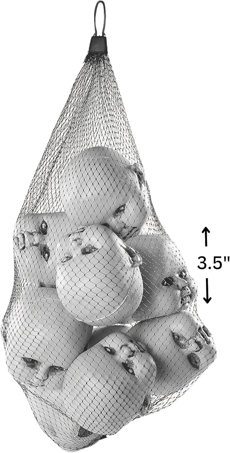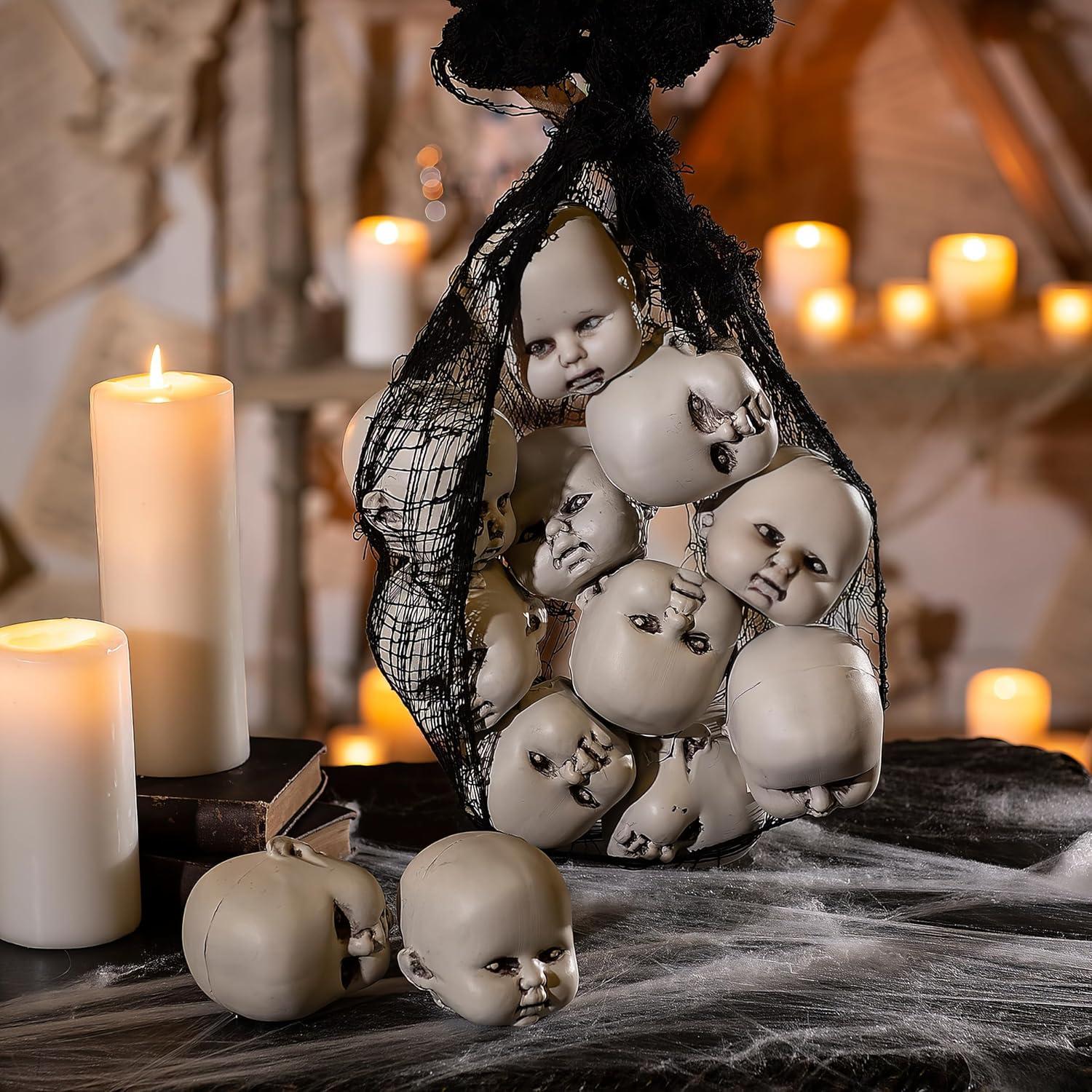 Fun Express 12 Plastic Halloween Doll Heads in Mesh Bag – 3 1/2″ Creepy Baby Heads for Halloween Decorations, Party Supplies, Scary Home Décor