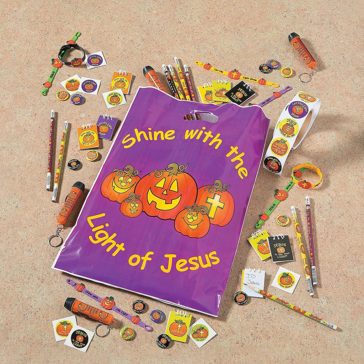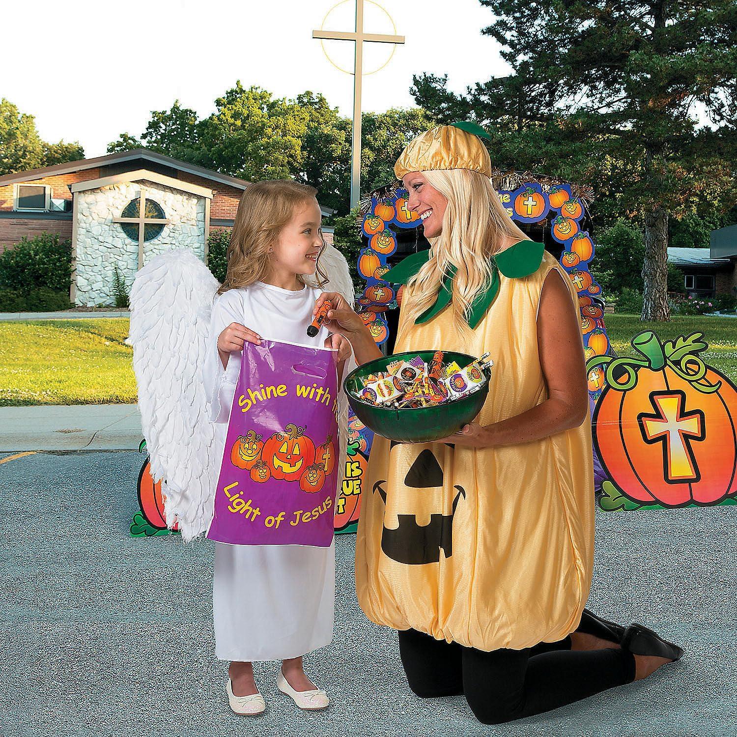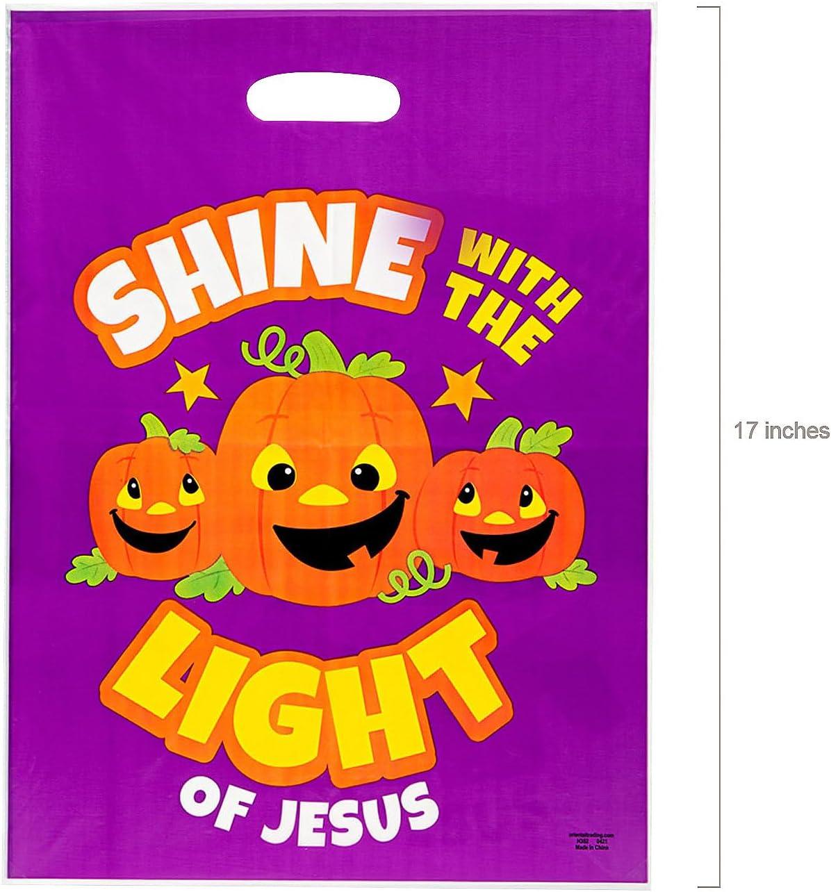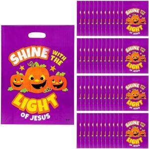 Fun Express Christian Pumpkin Plastic Gift Bags 50 Pack – Fall Halloween Treat Bags with Handles for Church Trunk or Treat Events | Religious Party Favors for Sunday School & Fall Festivals(Multicolour)