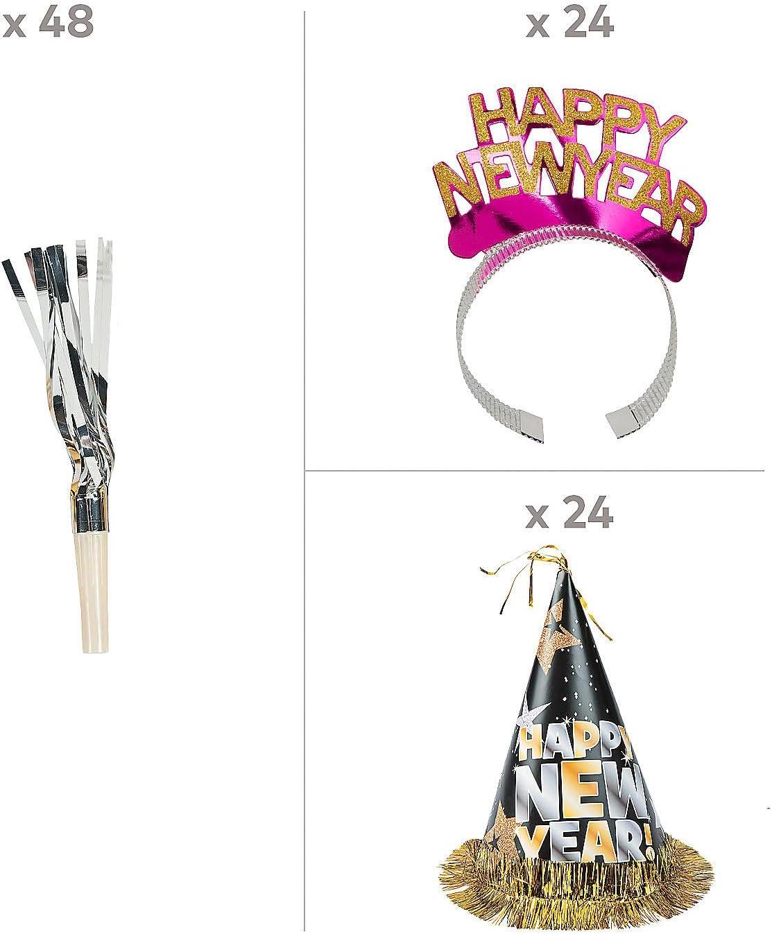 Fun Express New Year’s Eve Glittered Party Kit – Complete Celebration Set with Hats Noisemakers – Party Accessories for Large Gatherings Events & Festivities – Multi-Color Adults & Kids – 50 Pieces