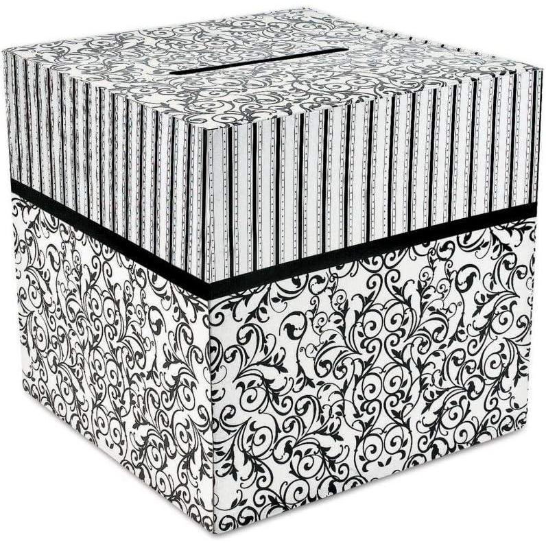 Black & White Wedding Card Box. A simple solution for your gift table troubles. The Black & White Wedding Card Box provides an easy to set up receptacle that matches many wedding colors with its black stripe and flourish pattern. This 12″ x 12″ card stock box is an elegant place to have all your wedding guests place their well-wishes. Simple assembly required. OTC