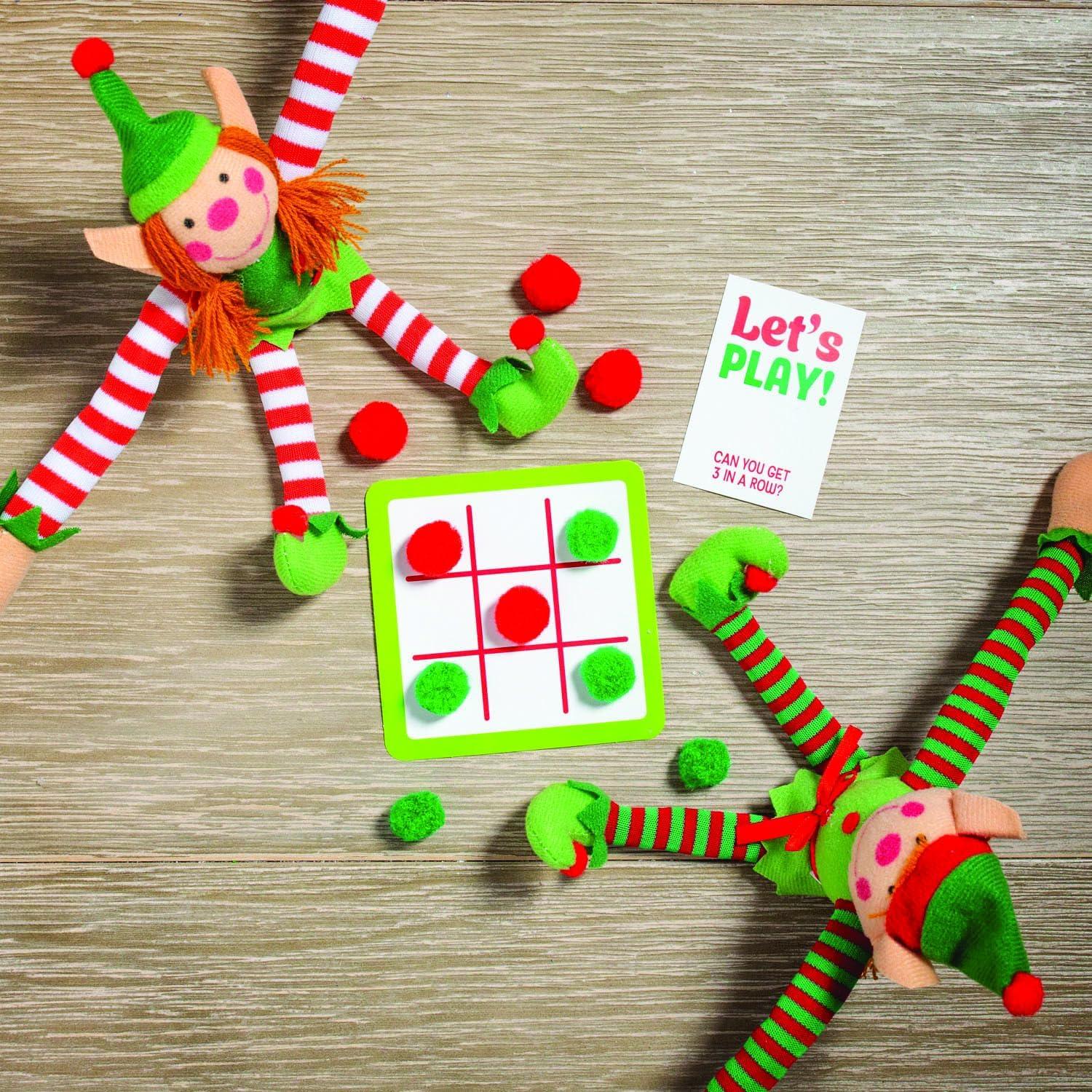 Each elf activity is super quick to set up, no prep required. One day, you might take two seconds to dump a bag of included pom-poms into a bowl for a makeshift elf ball pit, and another day you might prop your elf next to a Tic-Tac-Toe board as they wait for your kiddos to make their move with the included red and green pom-poms.