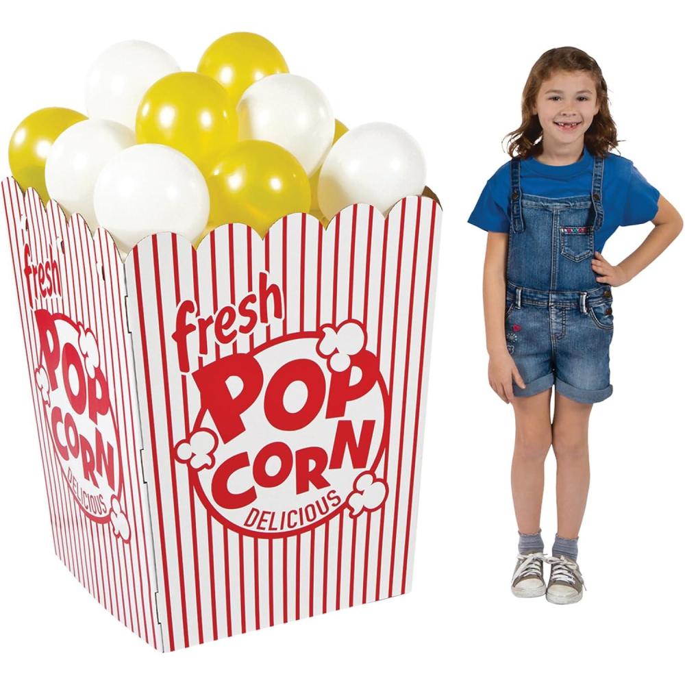 Fun Express Giant Popcorn Box Prop 3D Cardboard Stand-Up – Movie Night Decorations for Theater Party | Red & White Striped Design with Balloons | 37″ Tall Movie Theme Party Supplies