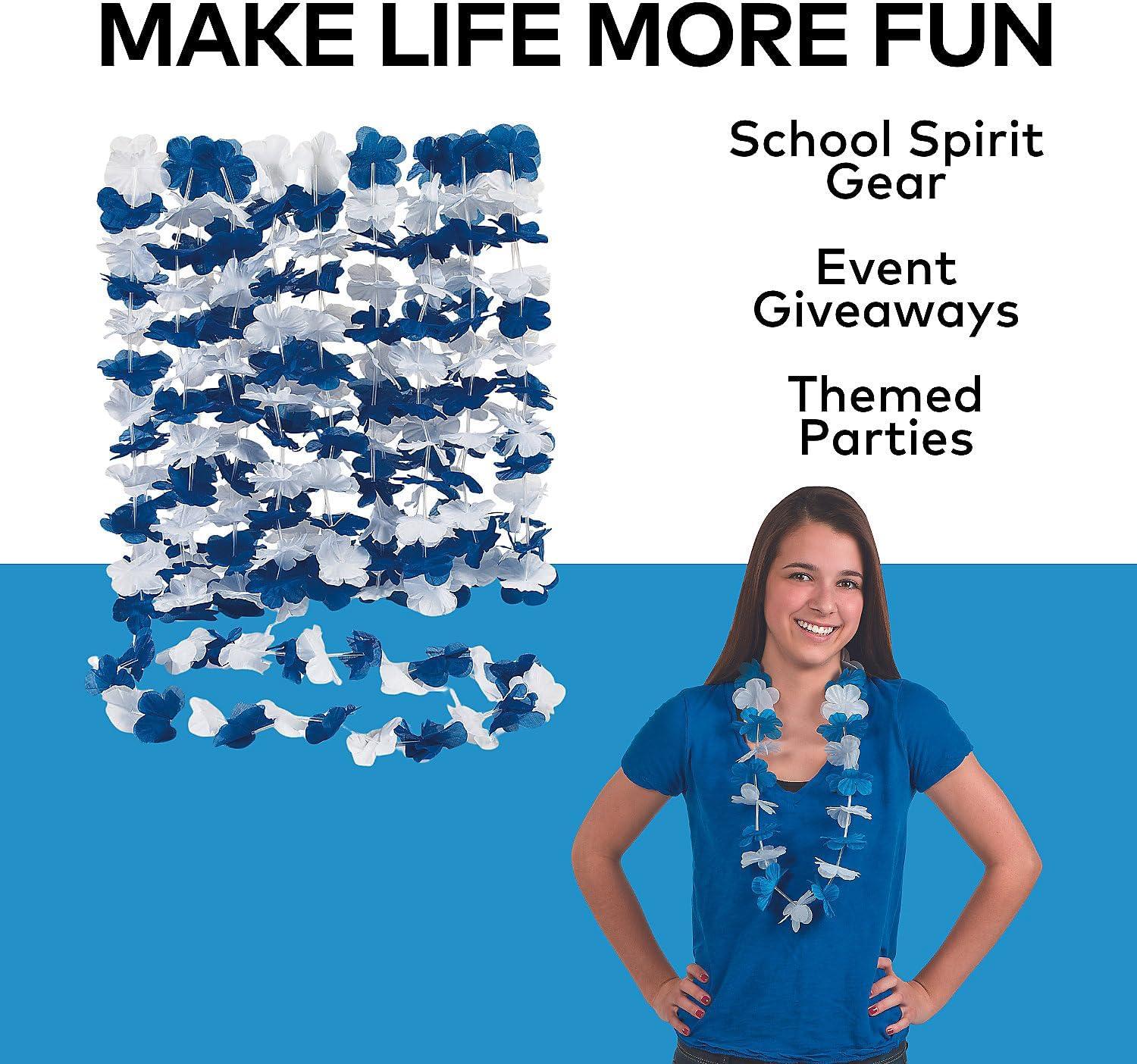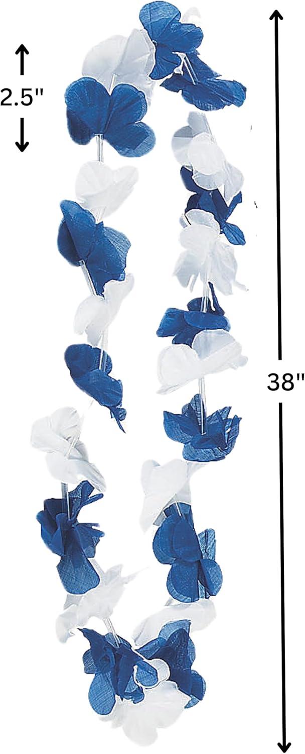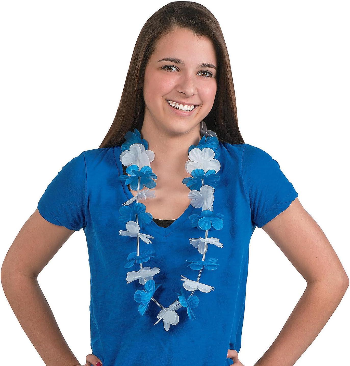 Fun Express Hawaiian Flower Leis – Set of 12 – Luau, Party and School Spirit Supplies – Blue, White