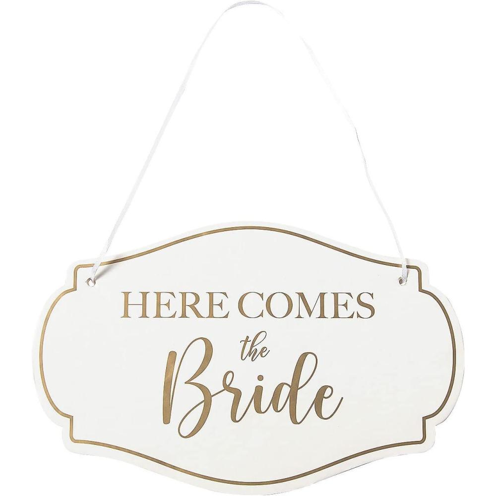 The “Here Comes The Bride” sign from Fun Express will add even more special touches to the soon-to-be bride's special day. This elegant and fun sign is a must-have for any bridal celebration, from bridal showers and bachelorette parties to engagement and wedding photos. Crafted from durable, high-quality cardstock, it measures 11″ x 7″ and features a charming design that complements any wedding theme. Whether you're hanging it on the bride’s door as she prepares for the ceremony, using it as a playful prop for photos, or showcasing it at the wedding or reception, this sign adds a personal and special touch to the occasion. Its versatile nature makes it perfect for creating lasting memories in wedding photos, and its sturdy cardstock ensures it can be reused for future celebrations or passed down as a keepsake. Ideal for brides, bridesmaids, event planners, or anyone organizing a bridal event. Order today and enhance your wedding or celebration with this lovely, fun decoration.