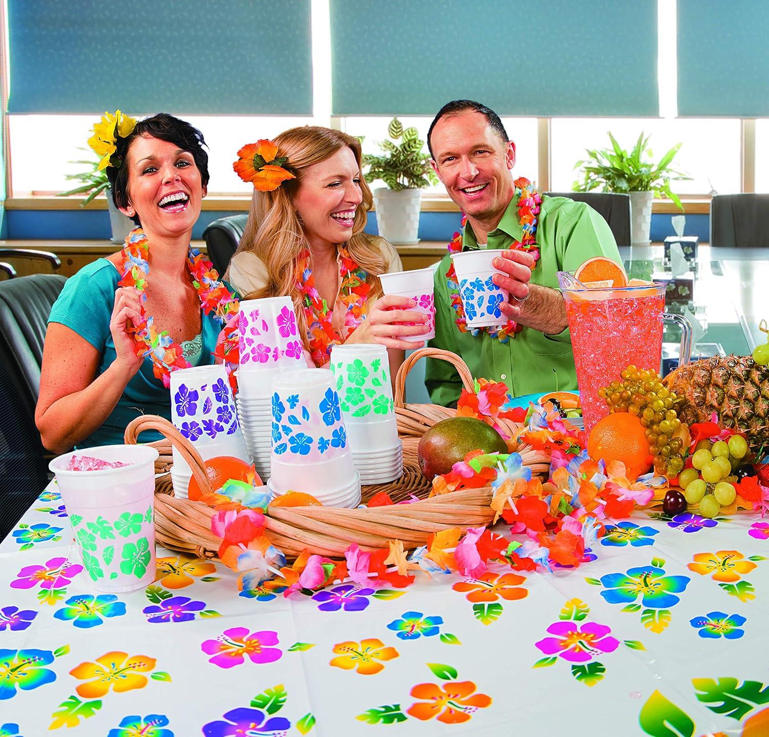 Bring easy island style to your buffet or dessert table with this hibiscus-print plastic tablecloth. The thin, slightly transparent cover adds bright color and protects surfaces during snacks, crafts, and drinks. When the fun ends, simply fold and toss for quick cleanup, no washing or ironing. Ideal for luaus, beach parties, pool birthdays, and tiki-themed cookouts.