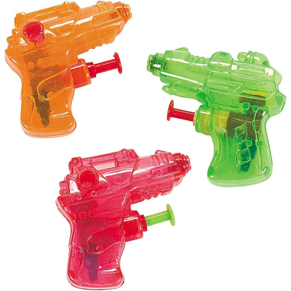 The Oriental Trading Mini Squirt Gun Assortment features orange, red and green plastic guns. Wet and wild fun for birthday parties or just have some squirt guns around for random water fights while the weather is nice. Made of plastic. Comes in a pack of 50. Measures 2-1/2-inch width by 2-1/2-inch height.