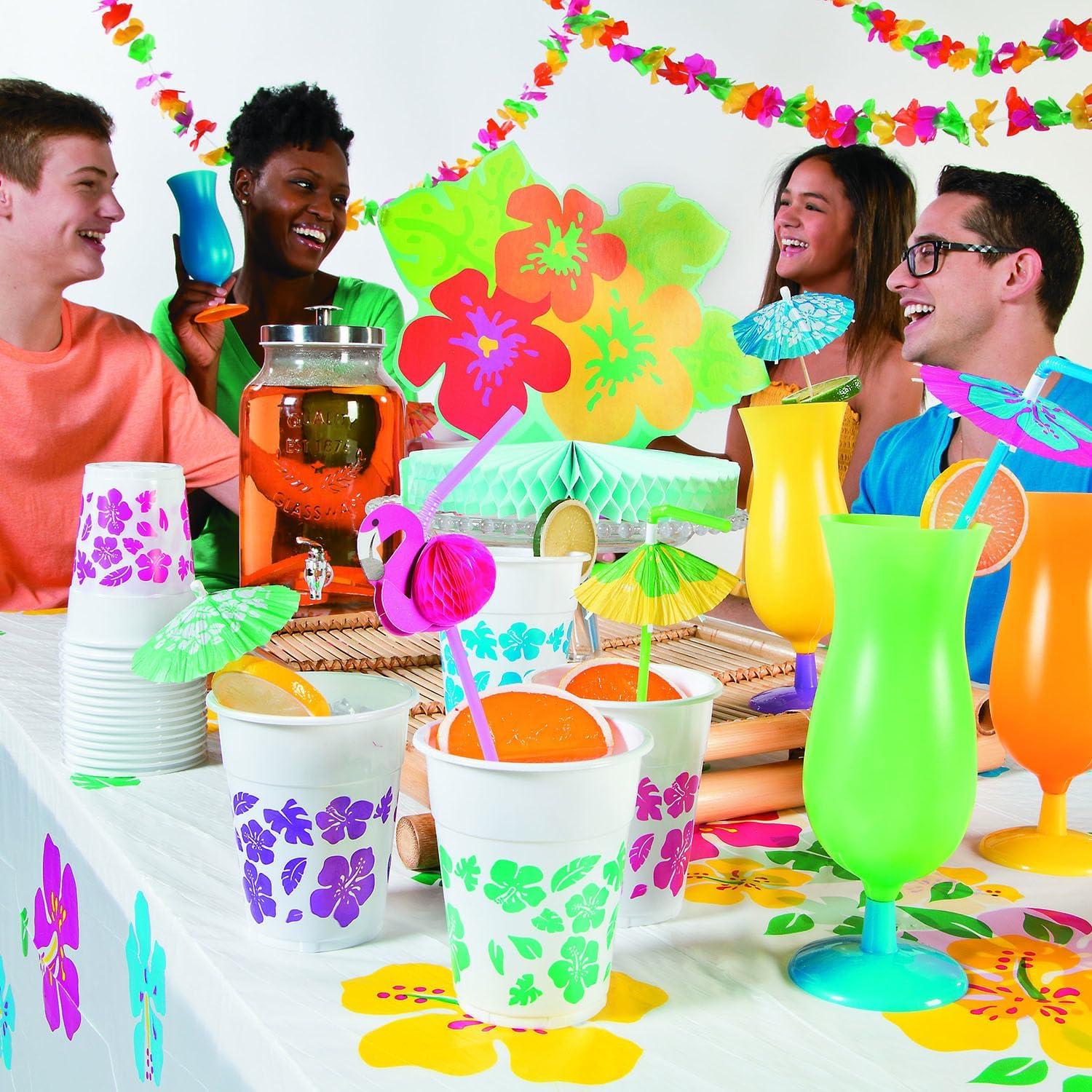 Vibrant neon party cups perfect for tropical celebrations: Set includes 12 colorful plastic hurricane glasses in assorted bright colors – orange, pink, blue, green, yellow & purple for festive drink presentation