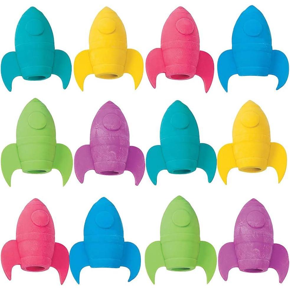 Fun Express Rocket Ship Pencil Top Erasers – Stationery – VBS Vacation Bible School Supplies/Decor – 12 Pieces