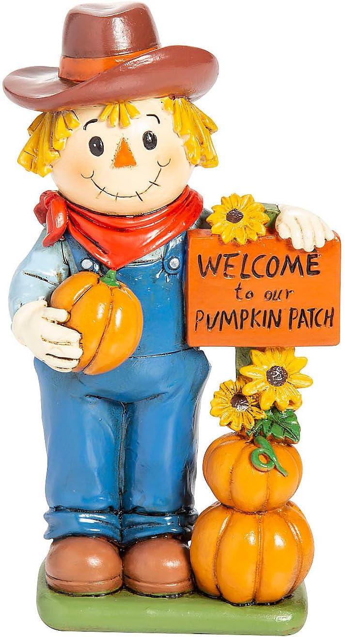 Create a warm and joyful autumn display when you add this little scarecrow figurine to your collection of knickknacks and shelf sitters! His vibrant fall tones, cute welcome sign and sweet scarecrow smile make him a perfect table centerpiece. Group him together with some smaller pumpkins and gourds to design a one of a kind seasonal scene!