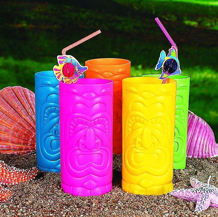 Perfect party cups disposable for authentic Hawaiian luau celebrations: Features vibrant multicolor tiki head design with 12 cups total (2 of each color) that bring tropical island atmosphere to any summer gathering or beach-themed event