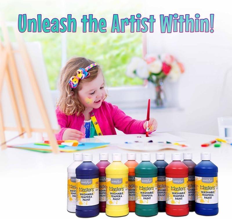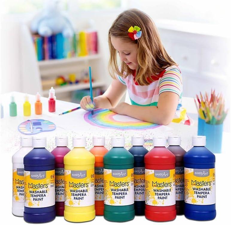 Unleash creativity with this vibrant 10-color washable tempera paint set! Each bottle contains 16 oz of rich, vivid paint perfect for bringing artistic visions to life. The set includes essential primary and secondary colors, making it ideal for color mixing and exploration. Designed with convenience in mind, these Handy Art tempera paints are completely washable, offering peace of mind for parents and teachers when artistic inspiration gets a bit messy. The non-toxic formula makes it safe for use in various settings including art classes, Sunday school activities, summer camps, and home craft projects. Whether creating masterpieces on paper, making holiday decorations, or working on group projects, this versatile paint set provides the perfect medium for artists of all ages. The generous 16-ounce bottles ensure plenty of paint for multiple projects and group activities. Perfect for classrooms, daycare centers, and home art stations, this comprehensive set encourages artistic expression while making cleanup hassle-free.