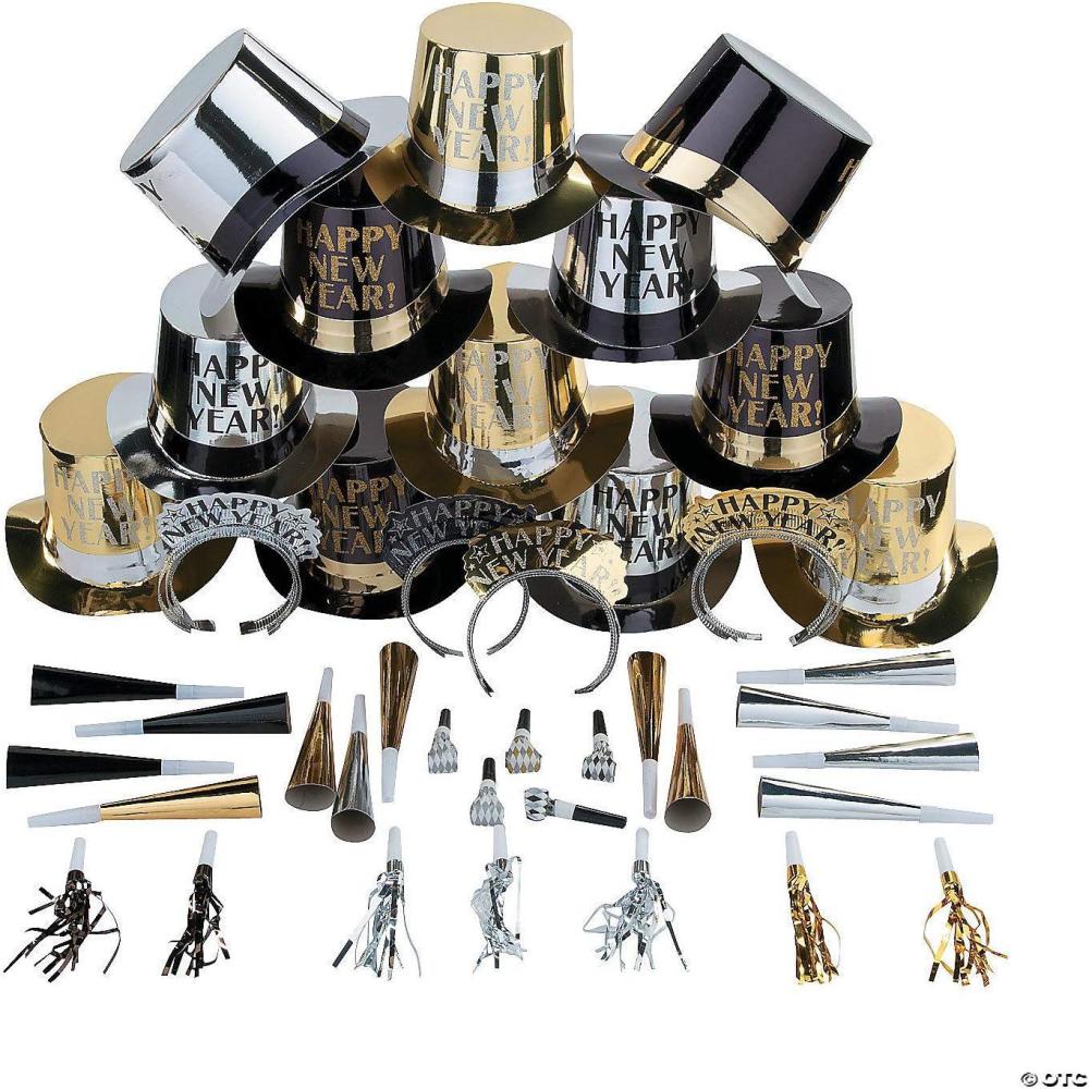 Celebrate the new year with up to 25 of your closest friends all covered in New Year's Eve party favors! This Get the Party Started New Year’s Eve Party New Year’s Eve Party has New Year's Eve party supplies for 25 party guests. Includes 12 paper top hats 13 paper foil tiaras 13 paper foil horns 7 foil squawkers and 5 paper blowouts. Includes 91/2″” hats 6 1/2″” x 4 1/2″” tiaras 8″” paper horns 9″” foil squawkers and 1/2″” paper blowouts. (50 pcs. per unit)