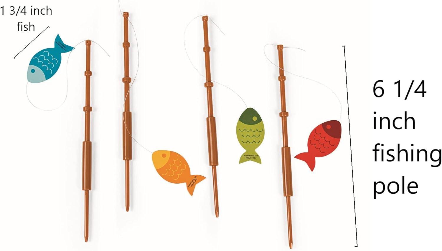 Each 6 1/4″ plastic pole includes fishing line with a 1 3/4″ paper fish attached.
