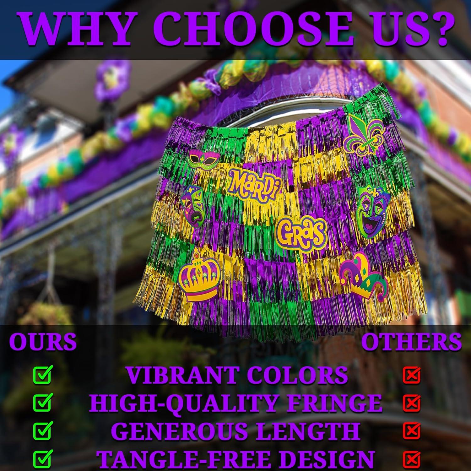 CELEBRATORY CHARM: Infuse your festivities with flair using the playful yet chic allure of our Mardi Gras Tinsel creating a visually stunning backdrop for your celebration