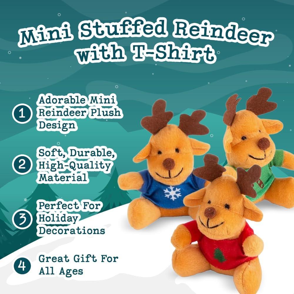 Mini Christmas Stuffed Reindeer – 12 Pack 4.5″ Plush Reindeer Toys with Holiday T-Shirts, Cute Christmas Party Favors, Stocking Stuffers, Classroom Gifts, Holiday Giveaways for Kids